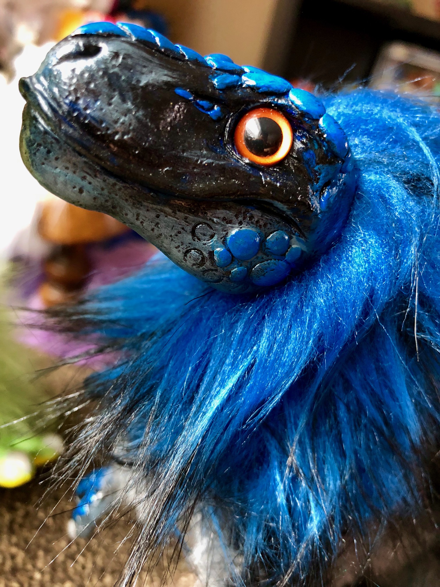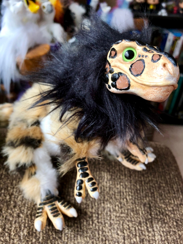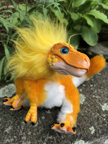 Baby T. rexes measure approximately 10 inches long, and stand naturally at about 4 inches tall. They are designed with such perfect balance that they can even stand on one foot to do kung fu poses! These little balls of fluff are the perfect size to sit in your lap for a cuddle, or to keep you company on a trip.